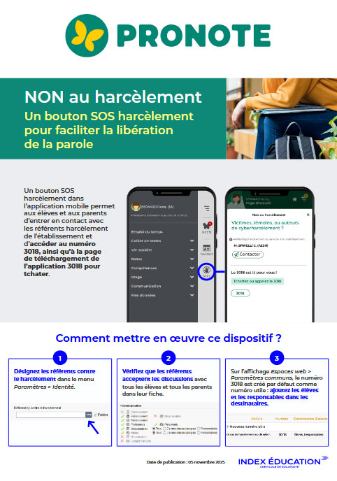 Un bouton SOS harcèlement dans l'application mobile permet aux élèves et aux parents d'entrer rapidement en contact avec les référents harcèlement de l'établissement et de disposer de numéros utiles.